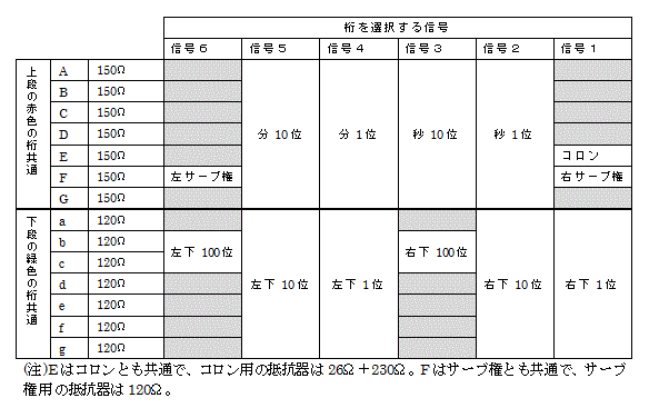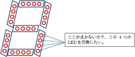 なお、LEDの故障で点灯しないのか抵抗器の故障で点灯しないのかの切り分けは、 上述したダイナミック点灯となっていることから、次のように考えれば良いだろう。 単一の桁数字だけで非点灯ならばそのセグメントを構成するLEDの故障、 複数の桁数字の同一セグメントが非点灯ならば抵抗器の故障。