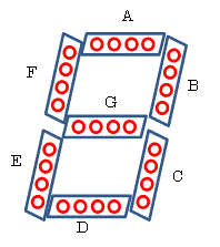 ① 最初は、1分(ふん)の桁のセグメントCが点灯しなくなった。(数字は7セグメントで構成されており、一般的に右図のようにA~Gで識別するようだ)